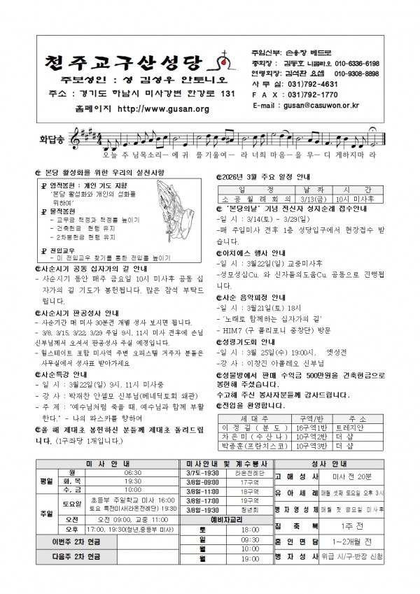 [천주교 구산성당 주보] 2026년 3월 8일 페이지 정보 작성자 사무장 댓글 0건 조회 110회 작성일 26-03-06 10:26 목록 본문 . 이전글[천주교 구산성당 주보] 2026년 3월 15일 26.03.13 다음글[천주교 구산성당 주보] 2026년 3월1일 26.02.27 댓글 0 댓글목록 등록된 댓글이 없습니다.