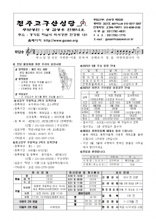 [천주교 구산성당 주보] 2025년 8월31일 페이지 정보 작성자 사무장 댓글 0건 조회 114회 작성일 25-08-29 10:08 목록 본문 . 이전글[천주교 구산성당 주보] 2025년 9월 7일 25.09.05 다음글[천주교 구산성당 주보] 2025년 8월 24일 25.08.29 댓글 0 댓글목록 등록된 댓글이 없습니다.
