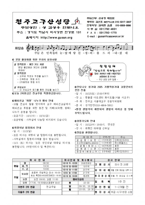 [천주교 구산성당 주보] 2025년 10월19일 페이지 정보 작성자 사무장 댓글 0건 조회 100회 작성일 25-10-17 10:04 목록 본문 . 이전글[천주교 구산성당 주보] 2025년 10월 26일 25.10.24 다음글[천주교 구산성당 주보] 2025년 10월 12일 25.10.10 댓글 0 댓글목록 등록된 댓글이 없습니다.