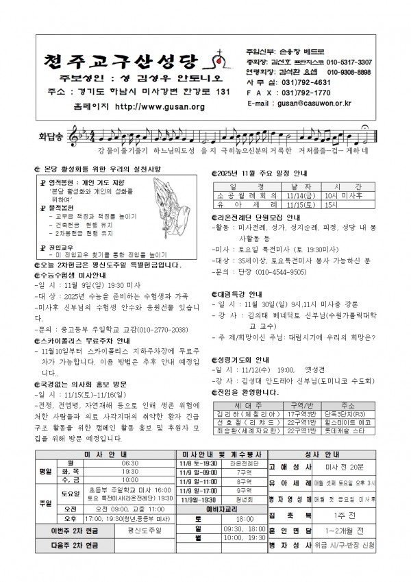 [천주교 구산성당 주보] 2025년 11월 9일 페이지 정보 작성자 사무장 댓글 0건 조회 180회 작성일 25-11-07 10:22 목록 본문 . 이전글[천주교 구산 성당 주보] 2025년 11월 16일 25.11.15 다음글[천주교 구산성당 주보] 2025년 11월2일 25.11.01 댓글 0 댓글목록 등록된 댓글이 없습니다.