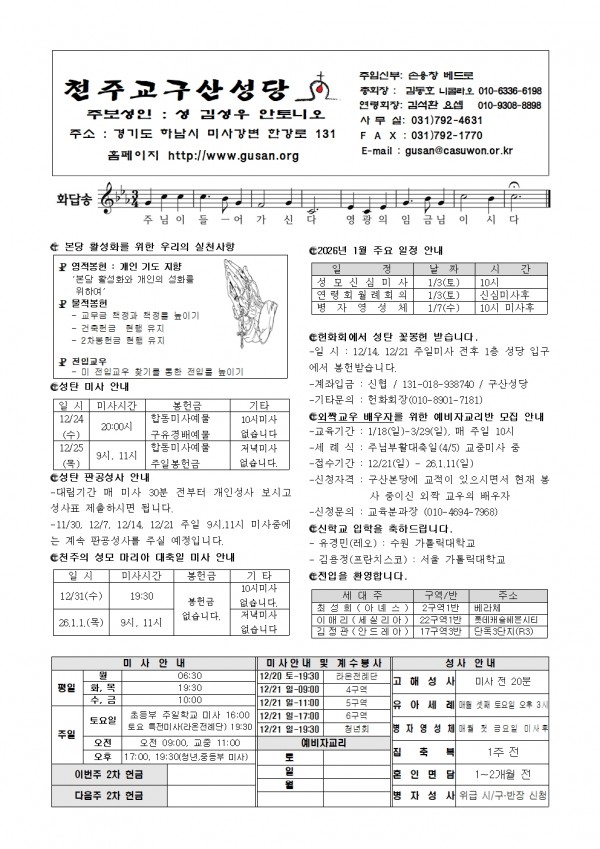 [천주교 구산성당 주보] 2025년 12월21일 페이지 정보 작성자 사무장 댓글 0건 조회 265회 작성일 25-12-19 10:09 목록 본문 . 이전글[천주교 구산성당 주보] 2025년 12월 28일 25.12.26 다음글[천주교 구산성당 주보] 2025년 12월 14일 25.12.13 댓글 0 댓글목록 등록된 댓글이 없습니다.