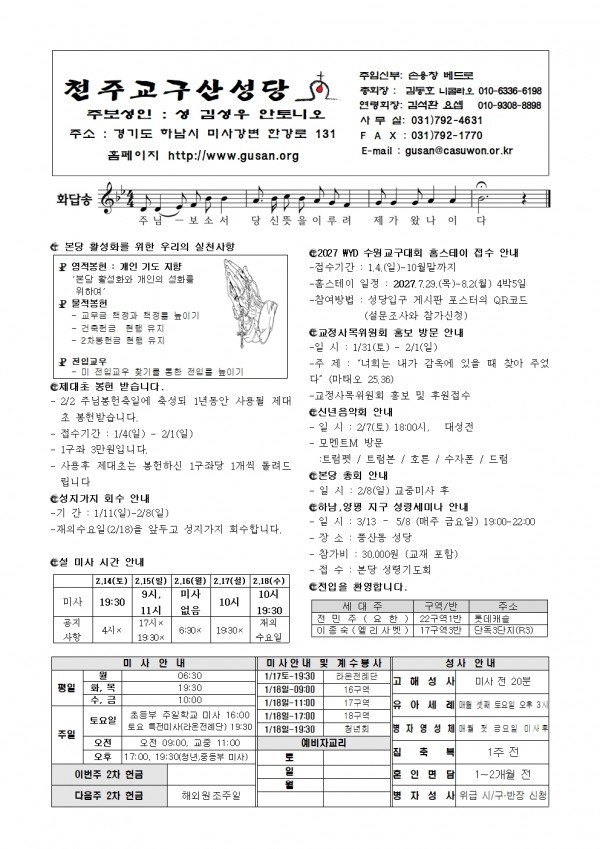 [천주교 구산성당 주보] 2026년 1월 18일 페이지 정보 작성자 사무장 댓글 0건 조회 201회 작성일 26-01-16 10:06 목록 본문 . 이전글[천주교 구산성당 주보] 2026년 1월 25일 26.01.23 다음글[천주교 구산성당 주보] 2026년 1월 11일 26.01.09 댓글 0 댓글목록 등록된 댓글이 없습니다.