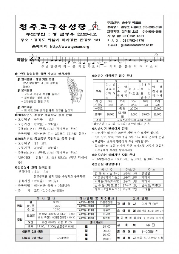 [천주교 구산성당 주보] 2026년 2월 22일 페이지 정보 작성자 사무장 댓글 0건 조회 182회 작성일 26-02-20 10:03 목록 본문 . 이전글[천주교 구산성당 주보] 2026년 3월1일 26.02.27 다음글[천주교 구산성당 주보] 2026년 2월 15일 26.02.13 댓글 0 댓글목록 등록된 댓글이 없습니다.